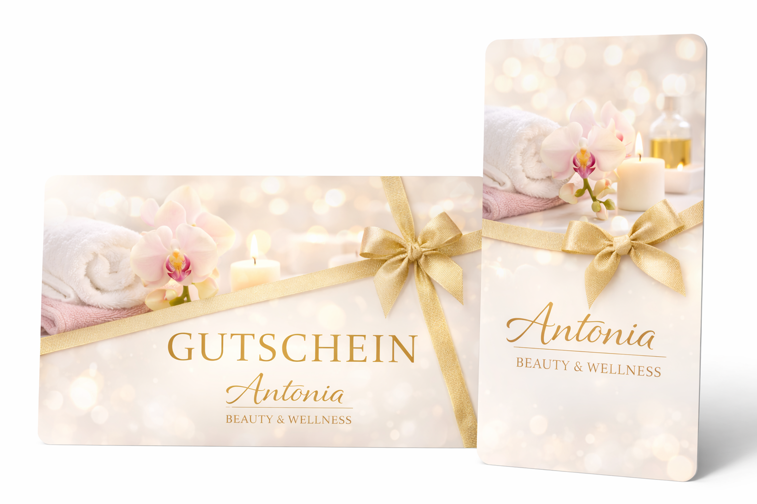 Verschenken Sie Entspannung und Schönheit. Dieser Gutschein ist für alle Behandlungen bei Antonia Beauty & Wellness gültig. Perfekt als Geschenk für jeden Anlass.